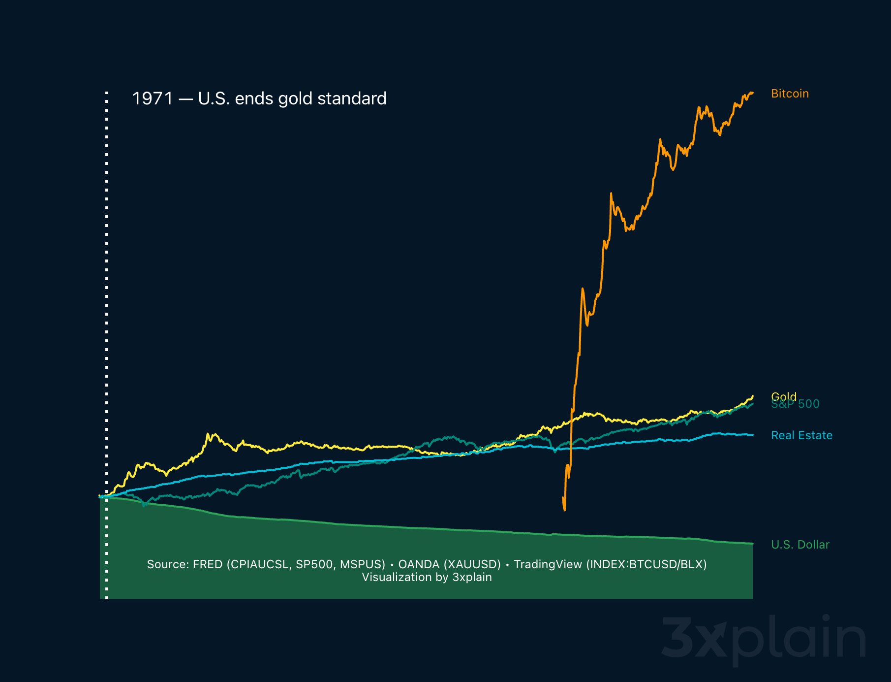 Since the U.S. left the gold standard in 1971, the dollar has lost more than 85% of its purchasing power. That means each dollar buys far less than it once did — not because the money changed, but because prices rose steadily over time.